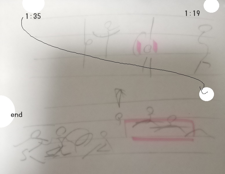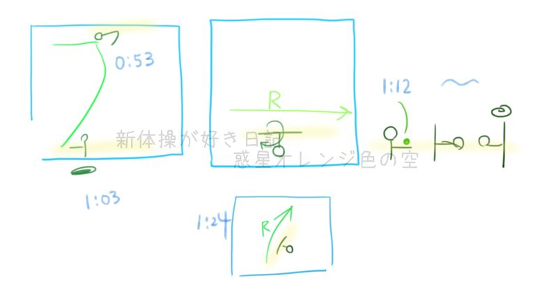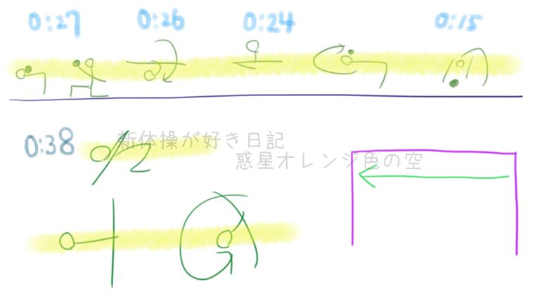 新体操では、さまざまな身体能力や手具操作を見せる必要があります。その中で今回は高さに注目します。 下の図をご覧ください。 2025.11 鉛筆絵を見ずに書き出しましたが、 ほぼ抽出点は同じですね。 ☆なお、どの文にも共通しますが、 この素晴らしい演技のなかでここに注目してみたとき について語っております。こうしてみるとここがこう 捉えられるんです。もちろんそのポーズには他の関連が あったり、他への符合があったり深く芸術的なものです。 いろんな見方や注目の仕方があるので、一つの参考までに ![]() 正面を横切って中段域が綺麗に表現されています。 印象をつけるのに序盤は重要。エレガントなDAと、 床と水平をきれいに取った開脚、 中央起点のぶれない開脚回転 こうしてみたときに、冒頭のポーズに意味が符合しますね 上段ではなく中段域への注意の払わせです。 新体操は、情操を刺激しますね。美しい。 さて、そしてエレガントなDAがあり、 どうでしょうか。中段で魅せることの難しさがよくわかると思います。 このDAがたくさんの選手に多用される理由がよくわかります。 90秒の演技の中で、中段を大きく主張した演技は5秒ほど。 回転中に中段が動いたり、 選手の頭が中心に来ることも もちろん重要ではありますが、 変化を見せるために、 固定した中段を魅せられる時間も確保したい。 その時に、このDAはすごい人気になる。 (エレガントDA) 中段を見せるかつ、得点になる。